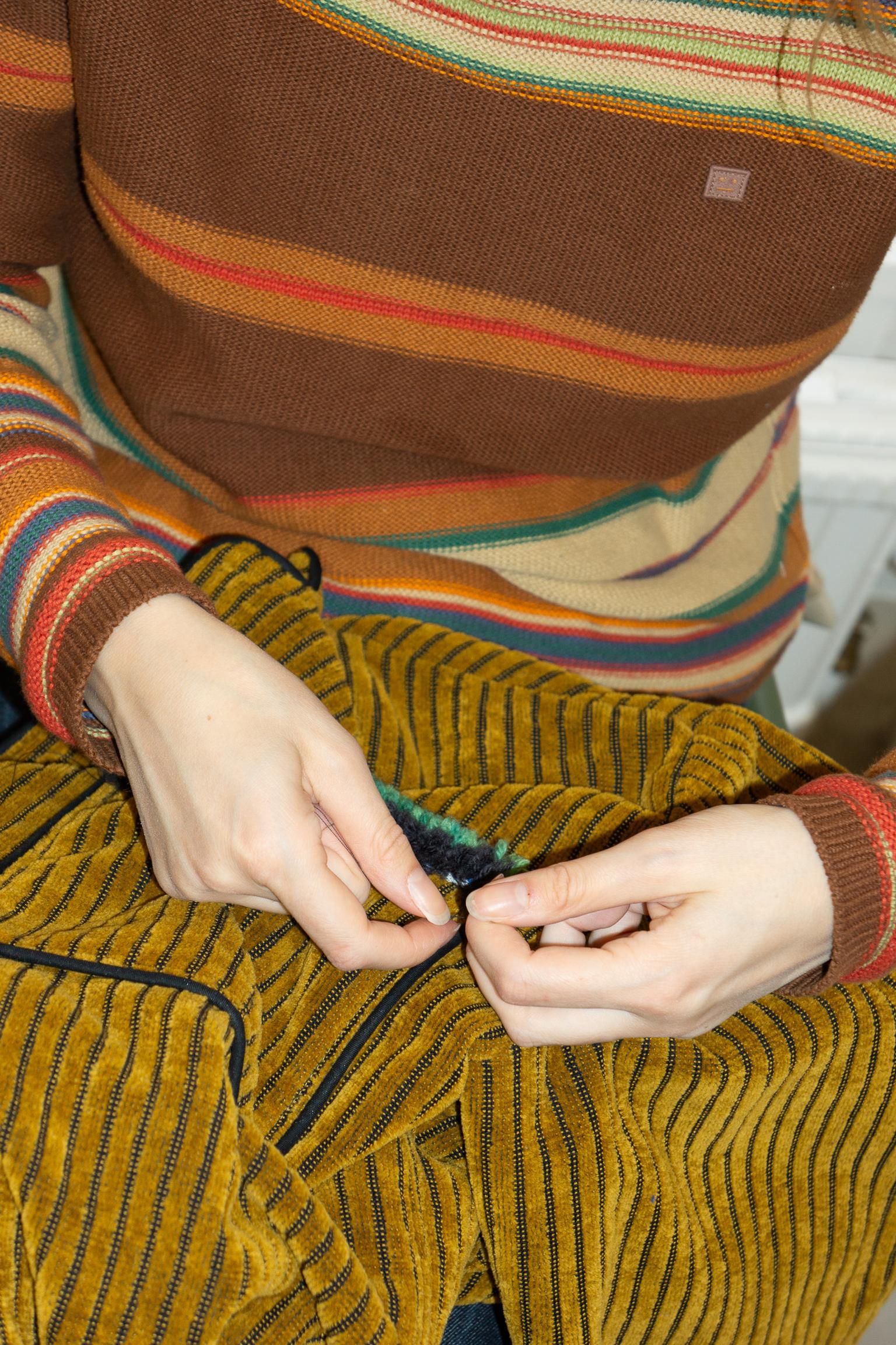 Knitted vest treated with acid dye and dye baths. Finished with wool-yarn embroidery along the edges for a textured contrast. All Dye Studio pieces are singular works, each made only once.