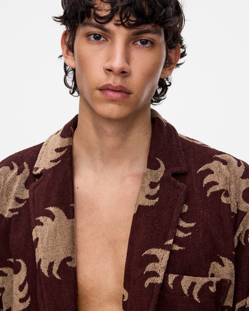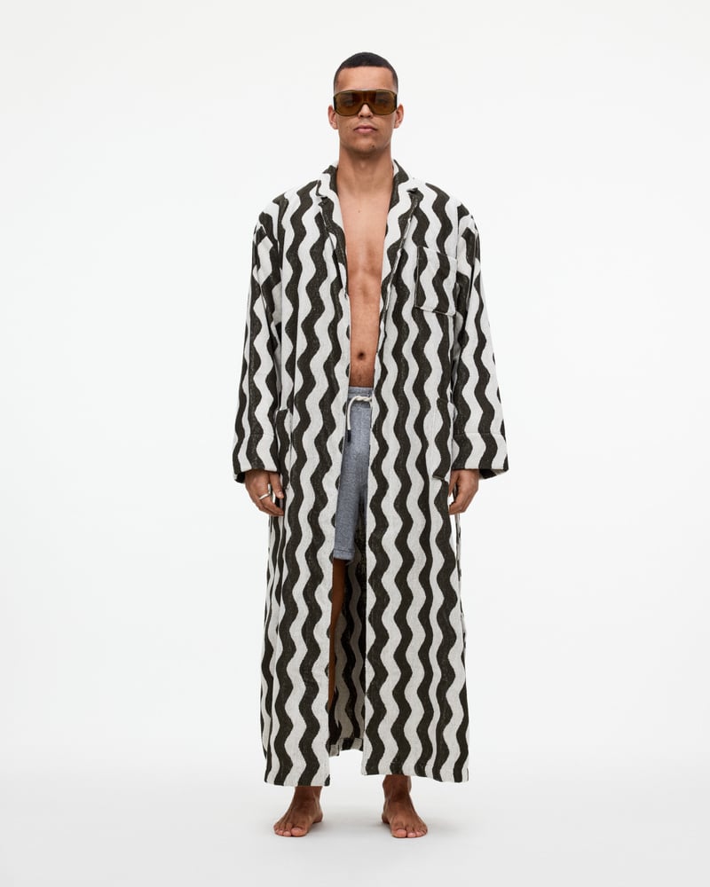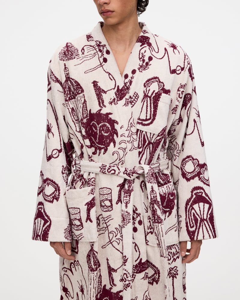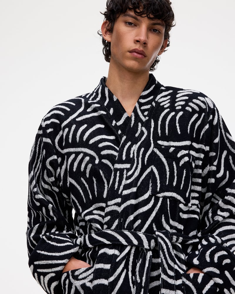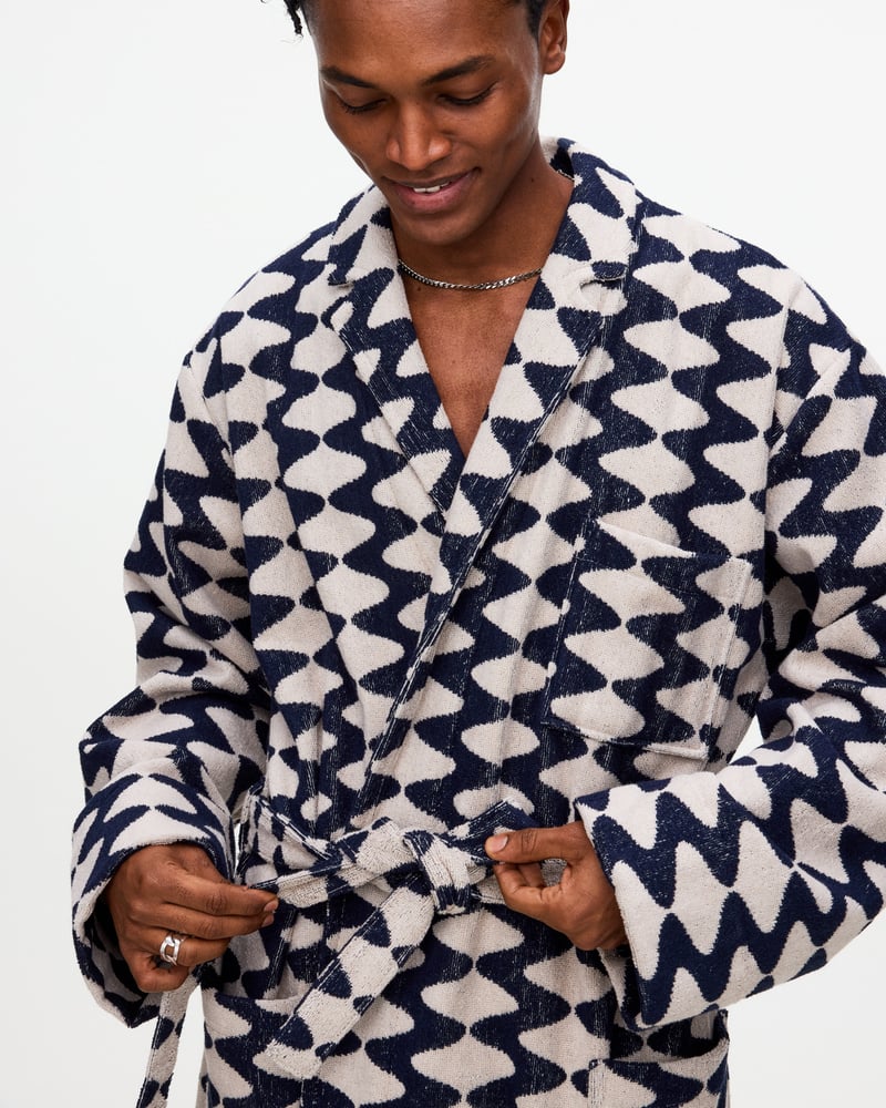 OAS badrockar för herr inkluderar modeller i jacquardvävd frotté, mjuk velour och längre silhuetter. Finns i mönster, enfärgade utföranden och avslappnade kimonosnitt.